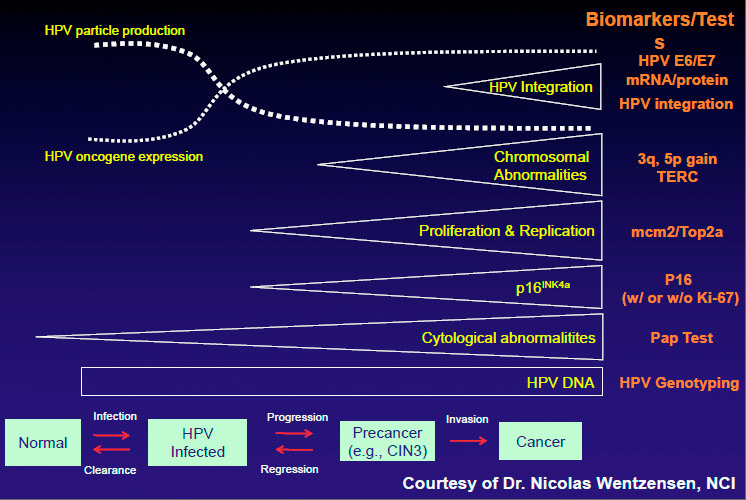 • Pap testing can be used among HPV-positive women to decide which women are in immediate need of colposcopy. Other biomarkers such asHPV 16/18 detection and in the future p 16 immunocytochemistry can be used to complement Pap testing to increase the sensitivity of disease detection among HPV positives.